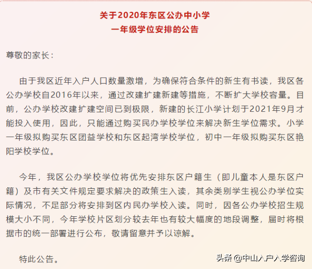中山市近年入户人口激增,而新建(在建)学校未能及时投入使用,公办学位供不应求。个别镇区相继发布学位告急及2020年中小学公办学位安排通知公告!