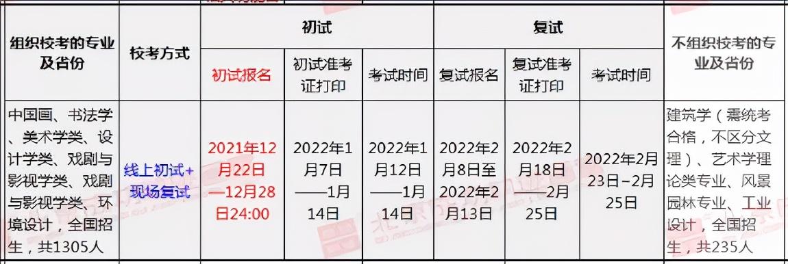 组织校考的专业为中国画、书法学、美术学类、设计学类、戏剧与影视学类、环境设计,全国招生1305人。
