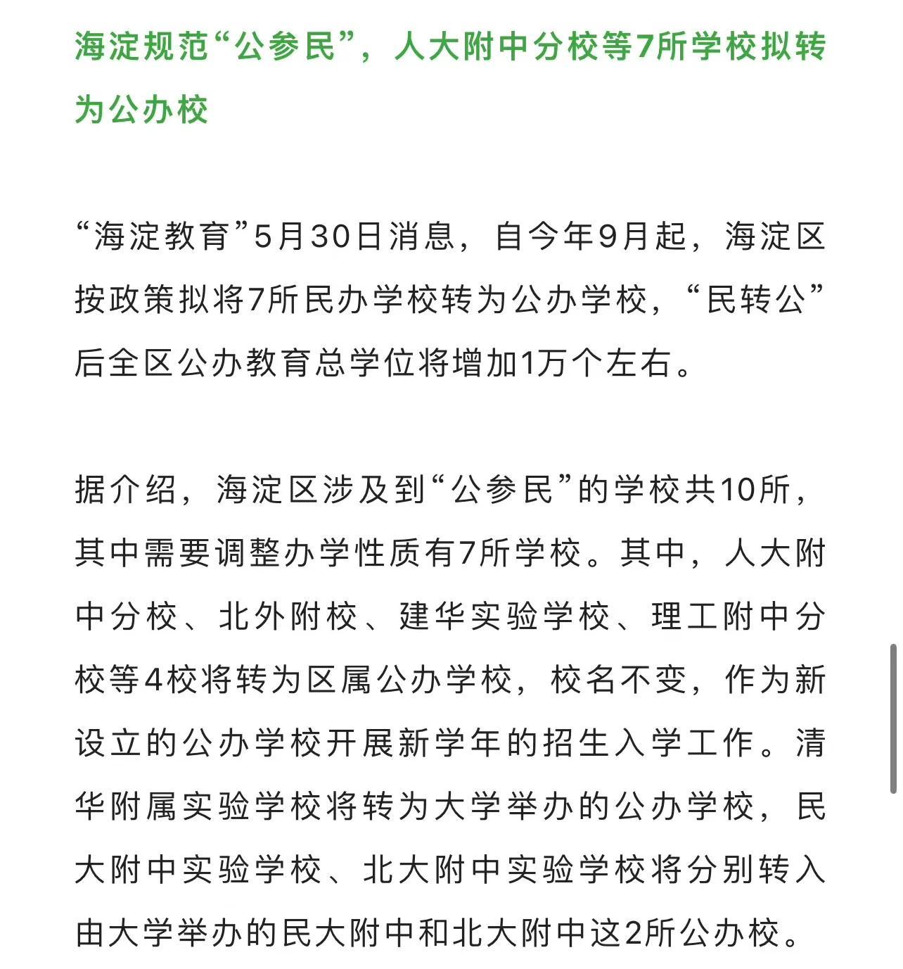 比如,北京海淀区的清华附属实验学校、人大附中分校等7所私立学校将于2022年9月正式以公办身份招生。