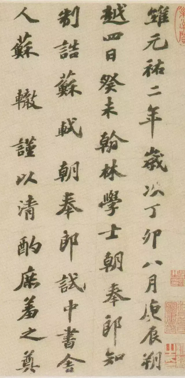 此卷楷书现存于上海博物馆,是苏轼与弟弟苏辙联名哀悼同年黄好谦的祭文,写于元祐二年。时苏轼五十二岁,书风古雅遒逸,真率自然,是苏轼传世作品中极少的楷书珍品之一,自成书以来,历来饱受赞誉。