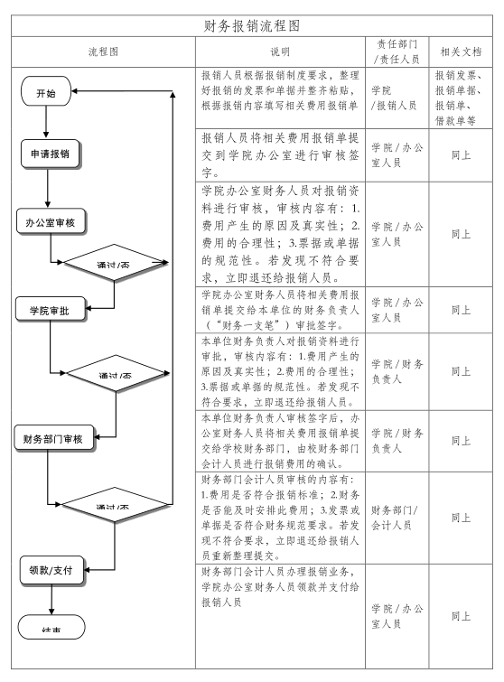 现以学院的财务报销业务流程为例进行了业务流程设计,该模板仅供各单位参考,不作为实际操作要求,请各单位根据本单位实际业务情况绘制业务流程图并配以文字说明。