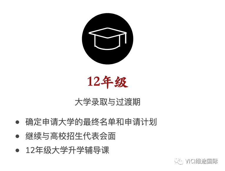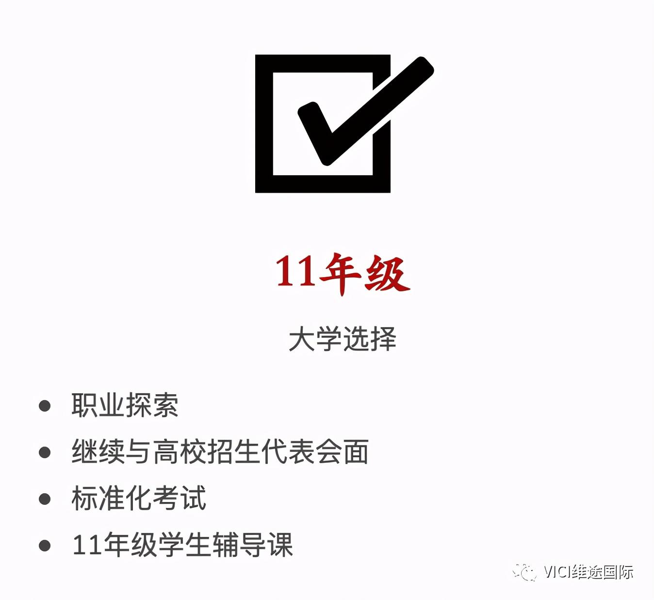 学生通过11、12年级的升学辅导课完成大学申请过程。学校导师会与学生进行一对一指导,引导学生选择最合适自己的学校。家长们也可通过一系列的导师处信息分享会来了解海外大学的申请过程。