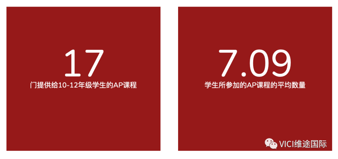 开设了17门AP课程,包括工作室艺术、混合材料绘画2D、混合材料绘画3D、英语语言和写作、学术调研、专题研究、物理1、生物、化学、环境科学、经济学、人文地理、统计学、计算机科学A、计算机科学原理、微积分AB、微积分BC。