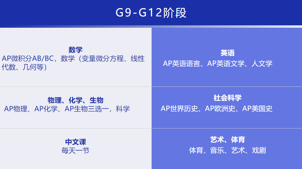 课程设置上,贝赛思国际学校课程体系以AP课程为主。课程体系是STEM-FOCUSED liberal arts program of study。STEM是以科学,技术,工程,数学为核心的文理兼修的教学体系。对课程标准有着严格、加速、超前的定位和要求,中小学阶段的课程进度快于普通美国中小学的课程大纲,更超前于一般国际学校,9年级开始修读AP课程;进入G12前需要完成至少8门AP课程,6门AP考试。课表按照五天一循环进行授课。