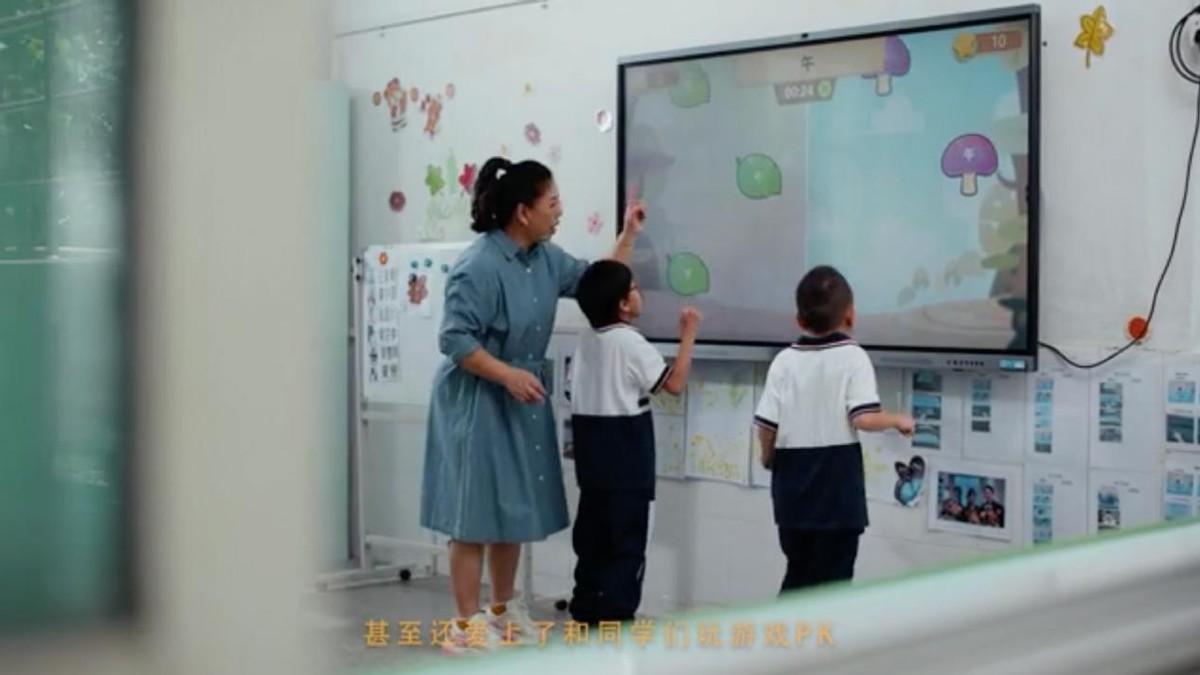 在教学1+1=2时,邹老师不再用卡片。她在大屏上用一个苹果克隆了⼀个苹果,出现了两个苹果。学生们都好奇地盯着屏幕。甚至还能迅速回答邹老师1+1等于多少的提问。