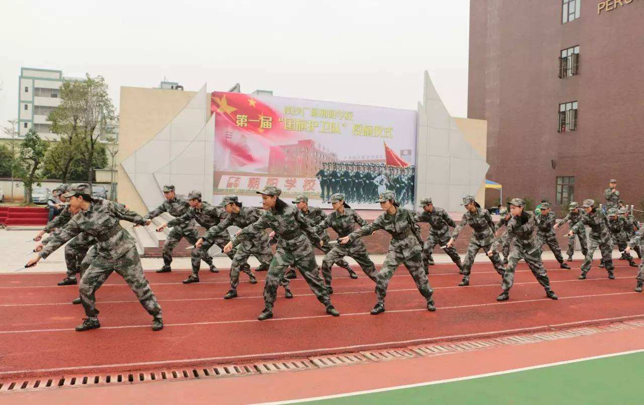 南沙广附朝阳学校国防班成立了国旗护卫队、军体拳方队、匕首操方队、擒敌拳方队。