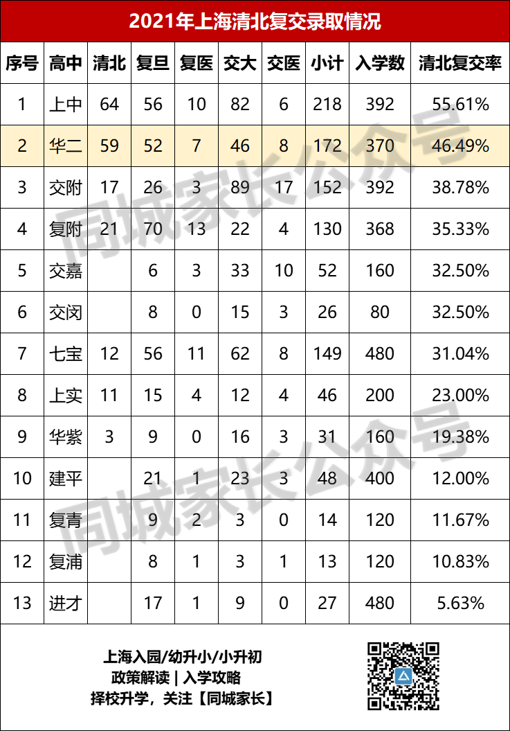 华二虽然综评看起来相对弱势,但是清北人数不少,2021年清北59人,仅比上中少5人,清北复交率直逼50%,也就是说进了花儿,半个身子就踏进了清北复交。