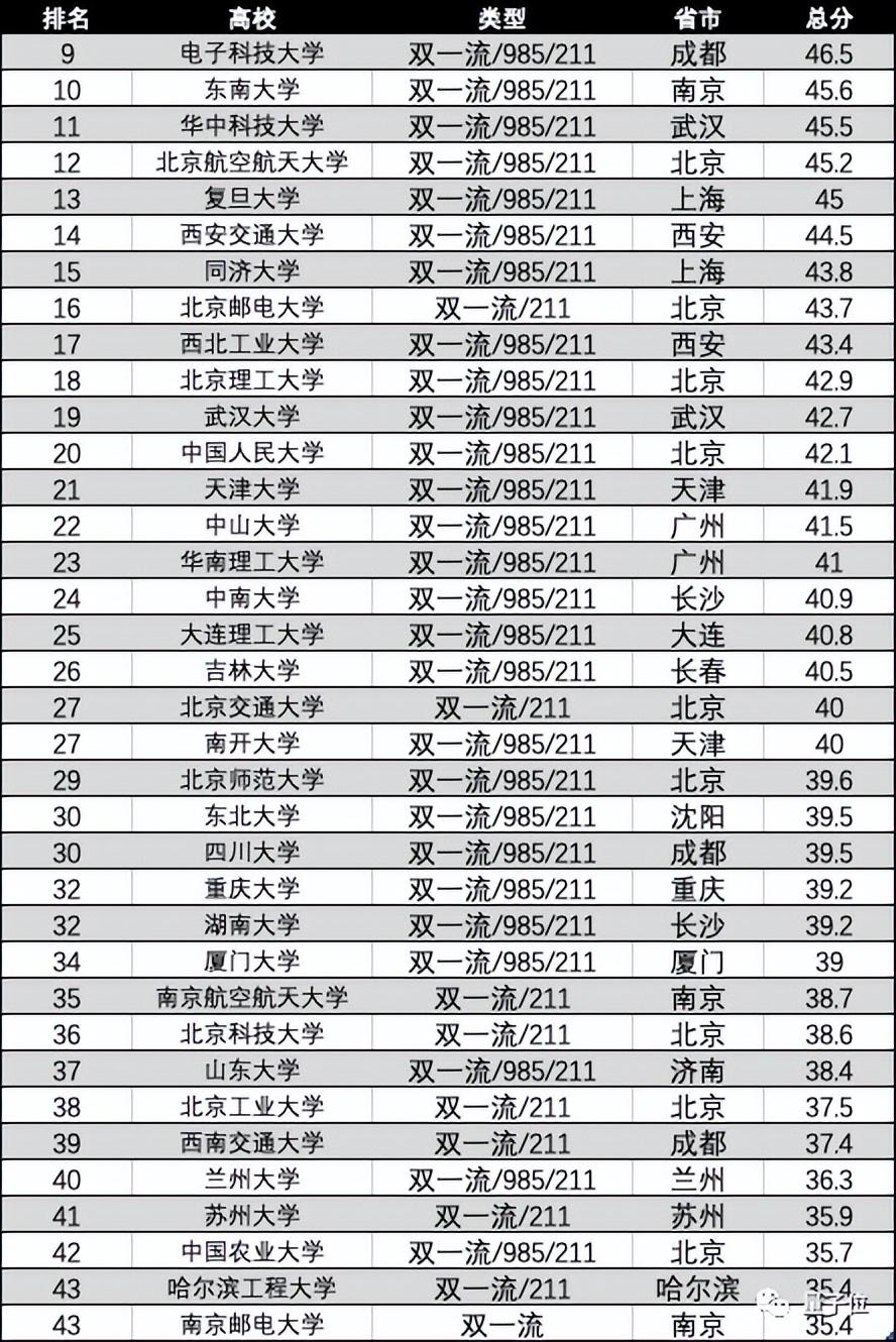 电子科技大学、东南大学、华中科技大学、北京航空航天大学、复旦大学以及西安交通大学等,依旧位于“第二梯队”的前茅。