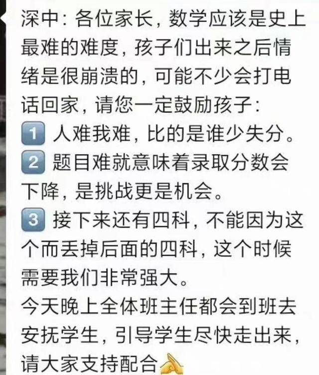 还有学校告诉学生家长,数学应该是史上最难的难度,很多学生从考场出来之后都是崩溃的,所以家长也要鼓励孩子,现在比的是谁少失分。