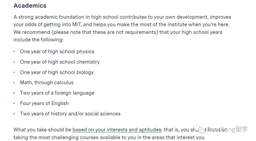在高中时坚实的学术基础有助于你自身的发展,提高你进入麻省理工学院的几率。我们建议你的高中生涯包括以下内容: