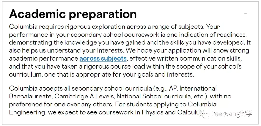 哥大要求学生对一系列的科目都有深入严格的探索。你高中课程的表现会展示你是否做好了对大学课程的准备,展示你开发的技能和学习的知识,帮助我们了解你的兴趣。