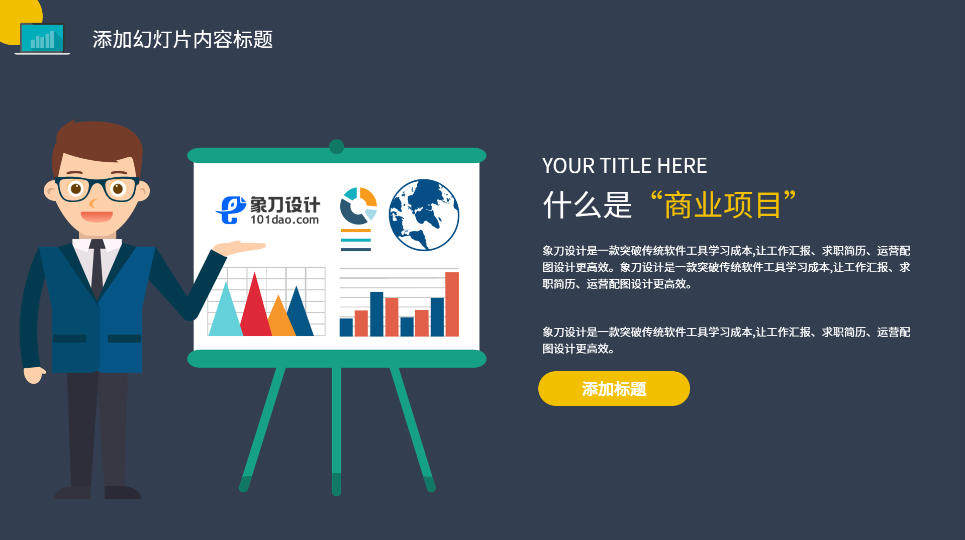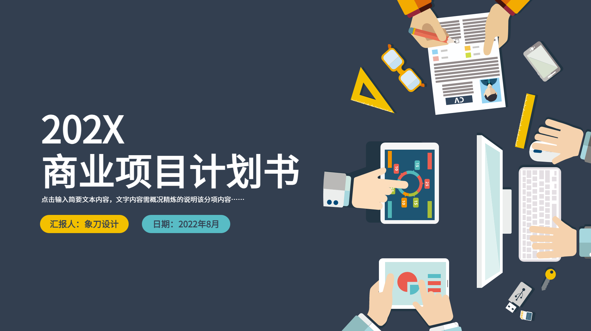 今天分享的是扁平化商业项目计划书PPT模板。这套项目计划PPT模板使用了卡通设计风格,一共12页,以深蓝色为底色,整体界面有创意。