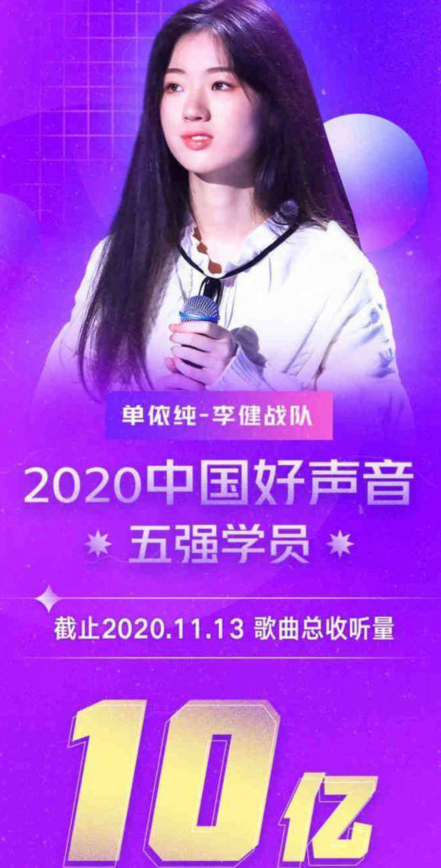 根据节目组官方数据,决赛未开打前,单依纯的累计歌曲播放量就已突破10亿,几乎是节目组所有歌曲的一半。