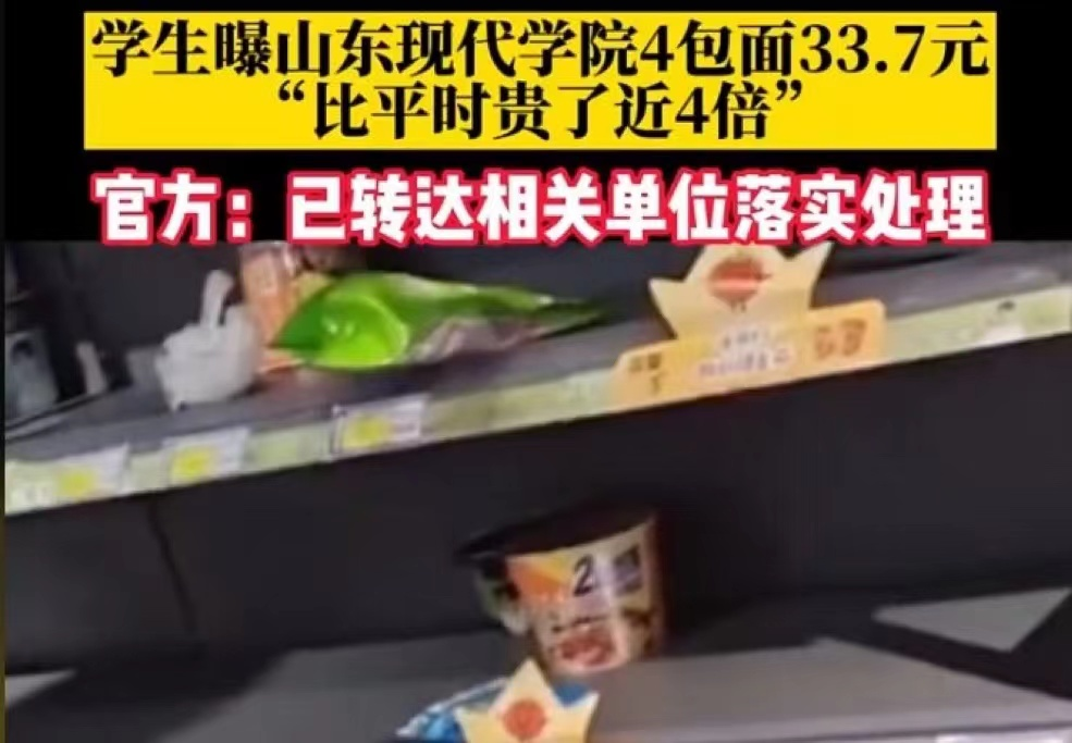 与此同时,山东现代学院一则“涨价”的消息再次登上热搜。封校时,小金同学去校园超市“万嘉隆”购买了三袋干吃面和一个桶面,被小卖部收了33.7元。要知道,平日里这些商品总价值不超过10元。