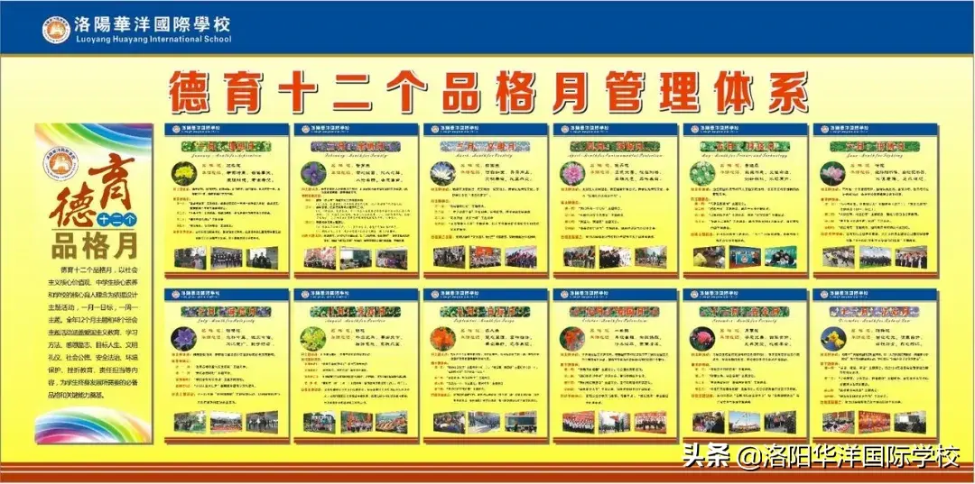 德育十二个品格月育人体系以社会主义核心价值观、中小学生核心素养、学校的核心育人理念和中小学生德育目标为理论依据精心设计,全年共设置12个德育月主题和48个班会主题,实现了德育目标具体化、课程化、体系化,全面塑造学生人格,让德育目标落地生根。