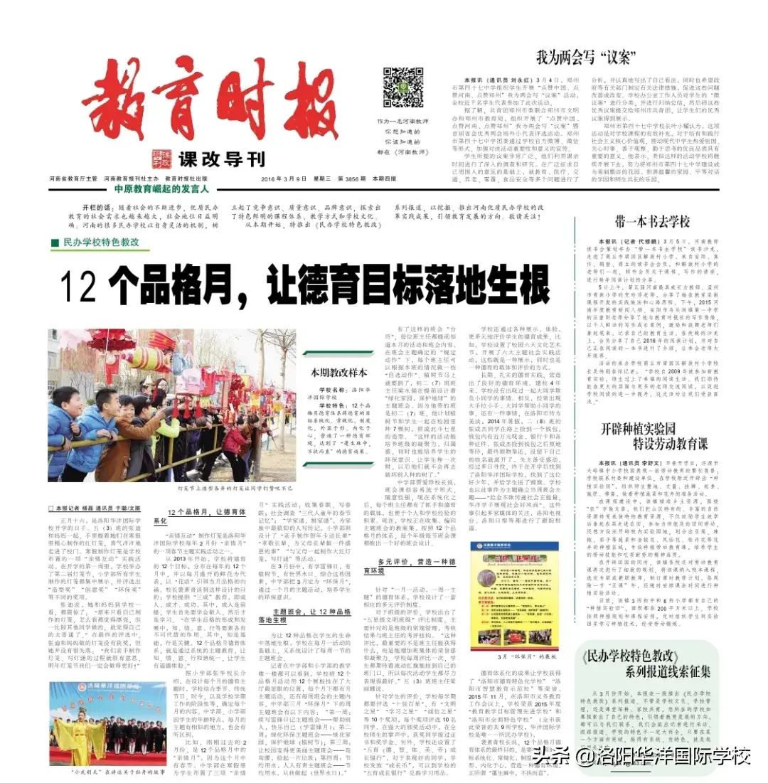 华洋以德育特色文化建设为根本着力点,经过不断探索实践,形成了独特的德育12个品格月育人体系,以“一班一品”特色班级文化、六大主题社会实践活动、六大校园文化艺术节和多彩社团活动为载体,全面提升学生核心素养,伴学生快乐成长。学校荣获“洛阳市德育特色示范学校”荣誉称号。
