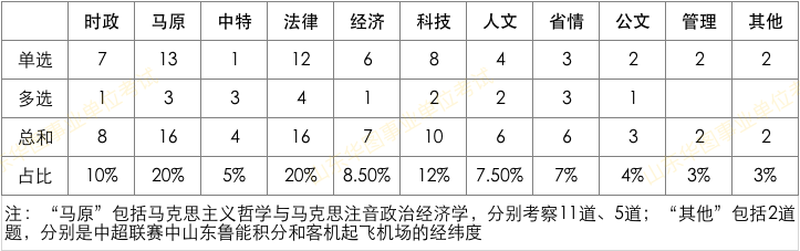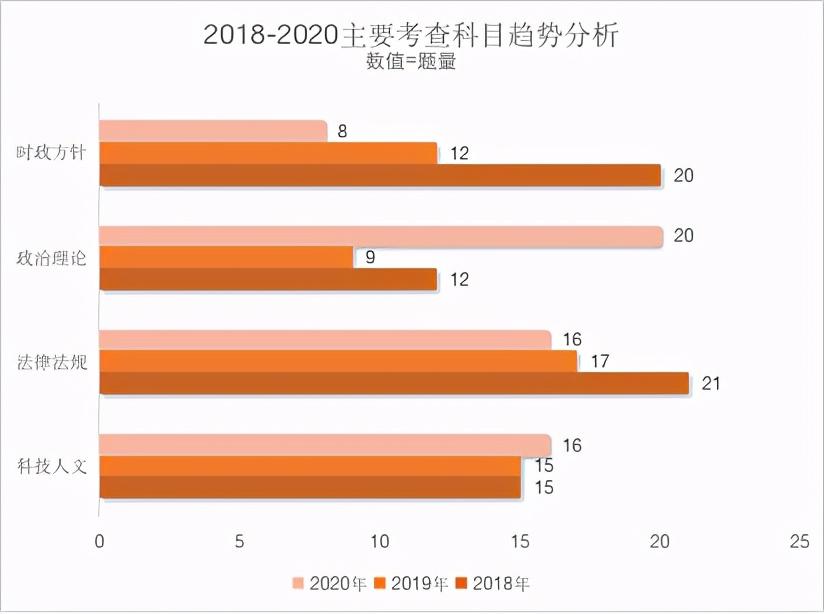 到了2020年的考试中,马克思主义基本原理、法律法规、科技人文常识考查较多,特别是政治理论题量增长明显;时政方针占比较之前有所减少;经济理论、省情等科目考查题量与往年持平。