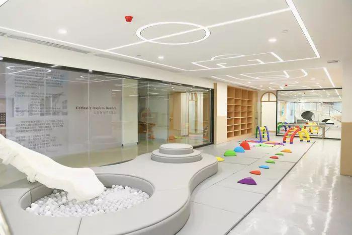 环境方面也是杠杠的,除了童趣满满的课室外,这里还有一间特别的感统训练室,在这里,老师会对学生进行体能训练,通过触觉、前庭觉、运动觉、本体觉等等的对应练习,提高孩子们的大运动能力。
