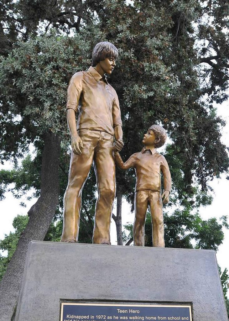 雕像上,14岁的史蒂文牵着5岁的提米的手,大步迈向前。这座雕像献给勇敢的史蒂文,也献给所有的孩子。希望走失的小孩,都能拉住史蒂文的手,找到回家的方向...