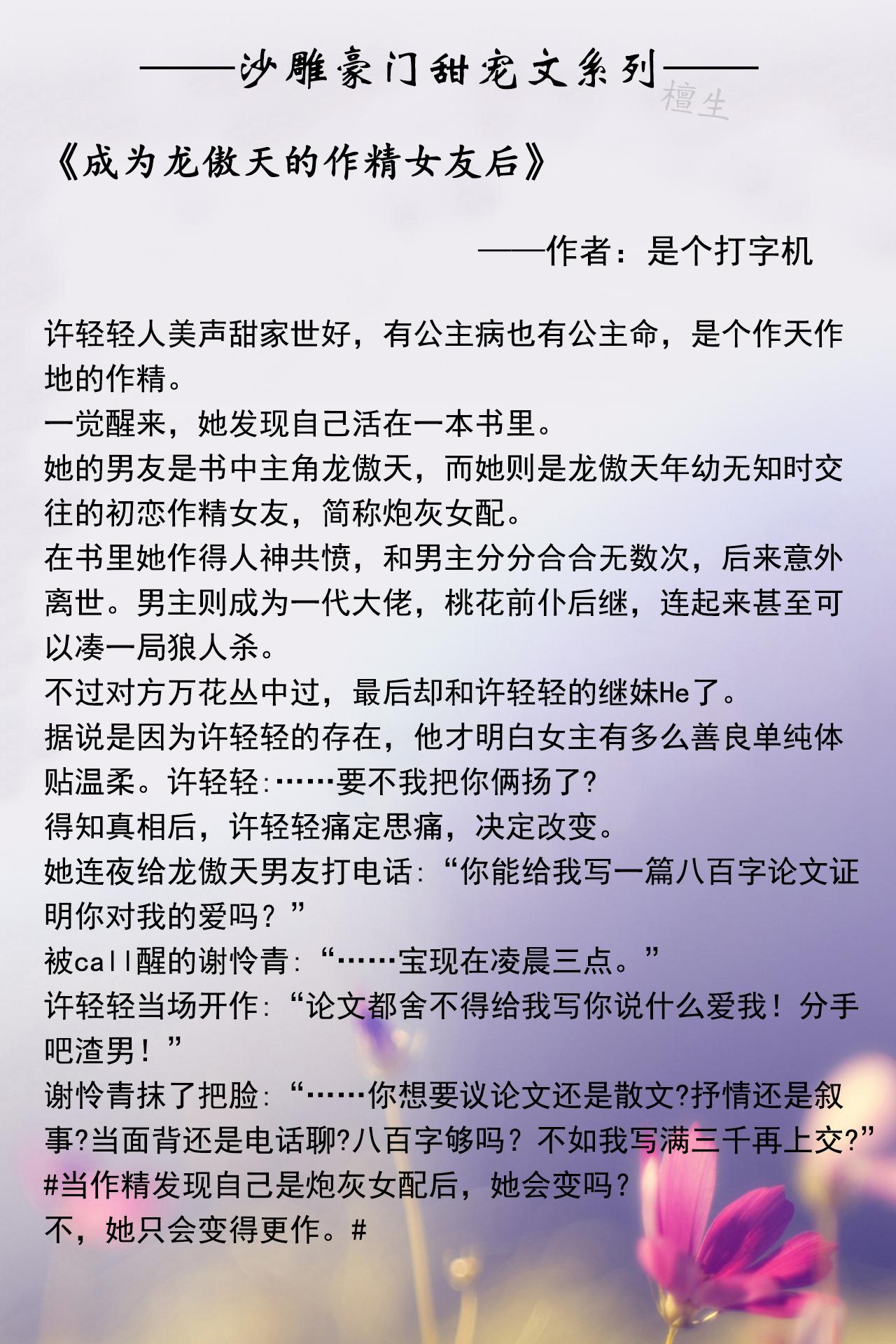 风格浓郁的一篇豪门小甜饼,女主是真作,不搞虚的;男主是真宠,24孝好男友。剧情兼具打脸逆袭,文风爽脆搞笑,男女主自始至终都只有彼此,前世男主为了追查女主横死的真相才对女配虚以委蛇,正是他逆转时光,才换来了这一世的圆满。这篇文个人观感极佳,小作精姑娘还挺可爱!