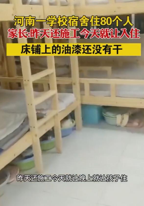 后来,当学生家长知道这件事之后更是愤怒不已。这些家长通过实地了解,发现,这间80人一间的宿舍竟然才建好不久,宿舍内味道很重,床架上的油漆都还没干,楼道外还在施工。