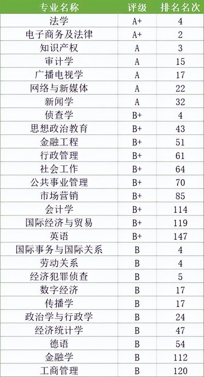 学校专业布局多元化,拥有30个本科专业,其中有11个专业获批国家级一流建设专业。在2022“软科中国大学专业排名”中,西政共有27个专业上榜。其中,法学与电子商务及法律专业获评“A+”。知识产权、审计学、广播电视学、网络与新媒体、新闻学等5个专业获评“A”级。