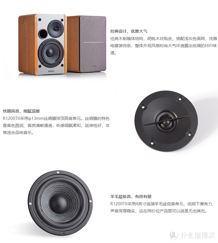 采用13mm丝绢高音+4寸羊毛盆低音单元,设计功率达到42w,信噪比75db,灵敏度85db.