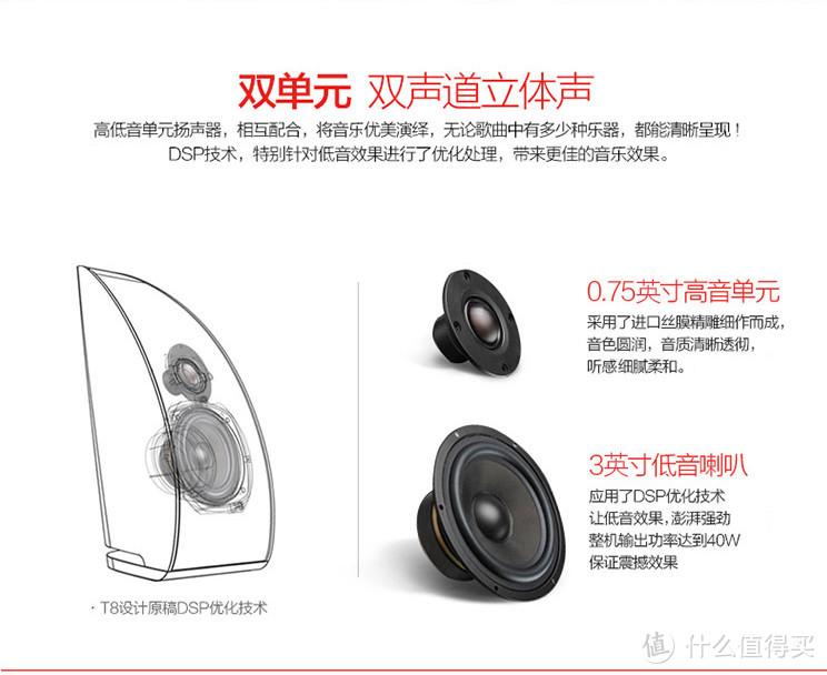 高音采用德国进口的蚕丝丝膜的0.75英寸高音单元,音质清晰,可以获得细腻自然的高音,低音采用3英寸纸盆,整机40W输出功率,动力澎湃。内置DSP信号处理。音箱侧面有可以触摸调节音箱,调节更方便。