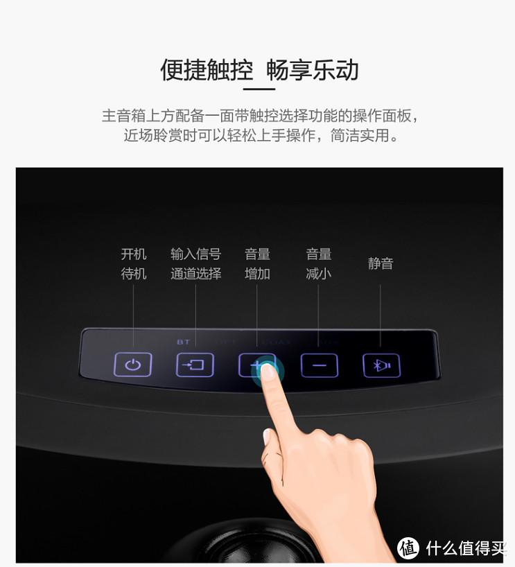 主音箱的面上集成一块带触控功能的面板,方便近场随手操控,同时还提供红外遥控器,适合远距离听音操作更方便。支持光纤、同轴线路以及蓝牙5.0输入,一机多用。