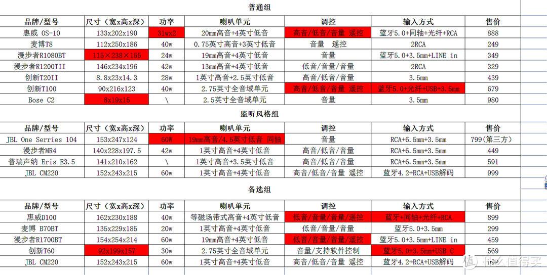 创新的T20II、 T100、博士的C2适合追求极致空间使用率的用户。漫步者R1080BT 兼顾了空间和一定音响效果,适合对价格比较敏感的用户。