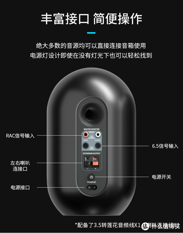 后置采用RCA双莲花输入,6.5大三芯输入,方便用不连接其他音响设备。