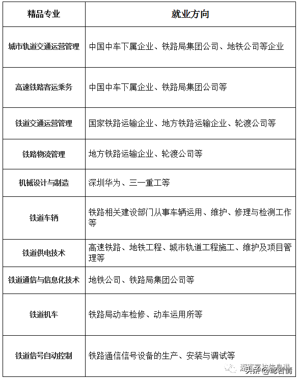 学院专业包括:铁路物流管理、铁道交通运营管理、动车组检修技术、制冷与空调技术、铁道机车车辆制造与维护、电机与电器技术、铁道信号自动控制、城市轨道交通机电技术、数控技术、铁道车辆、铁道机车、数字媒体应用技术、移动互联应用技术、物联网应用技术、信息安全与管理、城市轨道交通通信信号技术、铁道通信与信息化技术(铁道信息化)、铁道通信与信息化技术(铁道通信)、城市轨道交通运营管理、电子商务、会计、商务英语、应用电子技术(新能源电子技术)、应用电子技术(铁道电子技术)、电气自动化技术(铁道自动化)、电子信息工程技术、铁道供电技术、工业机器人技术、城市轨道交通车辆技术、机械设计与制造(中俄合作)、铁道机车(中俄合作)、城市轨道交通车辆技术(中俄合作)、电气自动化技术(工业控制)、机械设计与制造、高速铁路客运乘务。