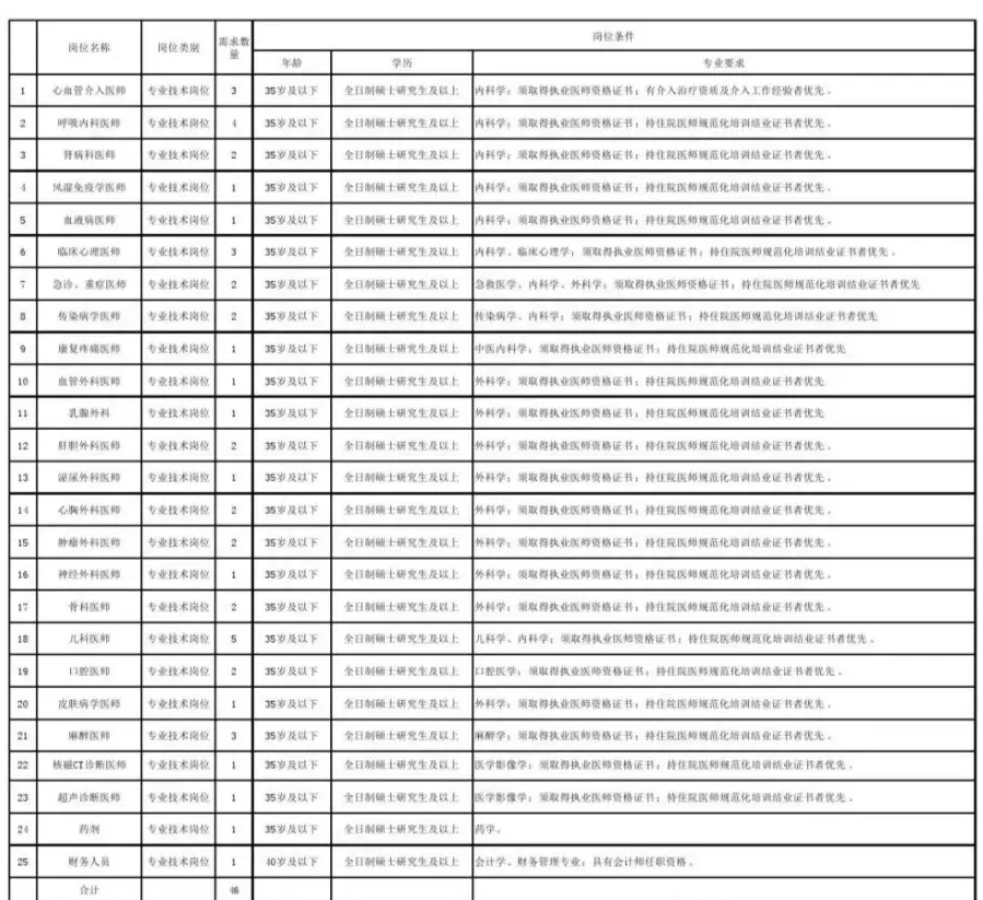 为进一步加强医院卫生专业技术人员队伍建设,结合医院发展需要和实际情况,2020年春季面向社会招聘工作人员116名(含紧缺岗位招聘计划46人,住培学员20人,护理岗位50人)。