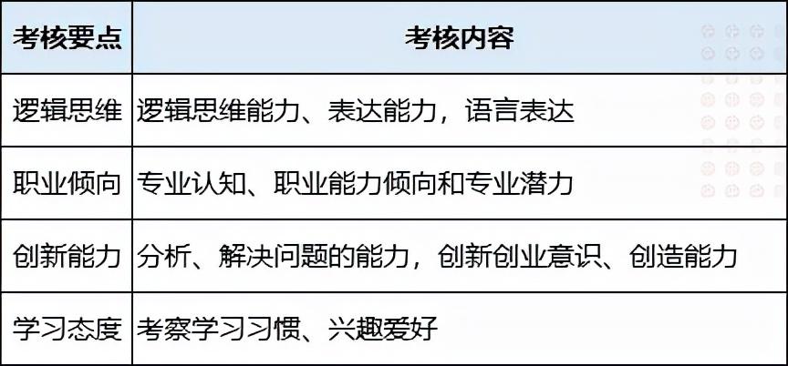 1.普高类:综合素质测试,采用现场考核和问答的方式进行,主要考察考生逻辑思维能力、语言沟通能力和职业倾向等基本素质;