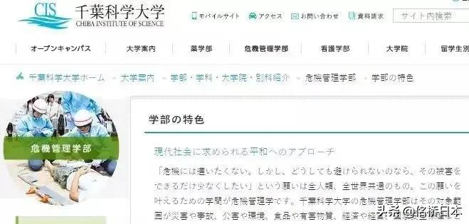 日本的千叶大学,下设的危机管理学部、药学部以及看护学部,这3个专业相互提携,且在这个学部,学生可以根据自身的情况,学习到构建安全、安心社会所需要的知识和技能。