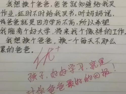 家长对学生寄予厚望的原因有两种,一是希望学生好,二是不想让学生走自己的老路,这名小学生的作文字数不多,但却涵盖了家长对他的期望,也表达了他对家长的爱,只见他在最后写道:我想换个爸爸,换一个每天不那么累的爸爸,老师果断给“优”。