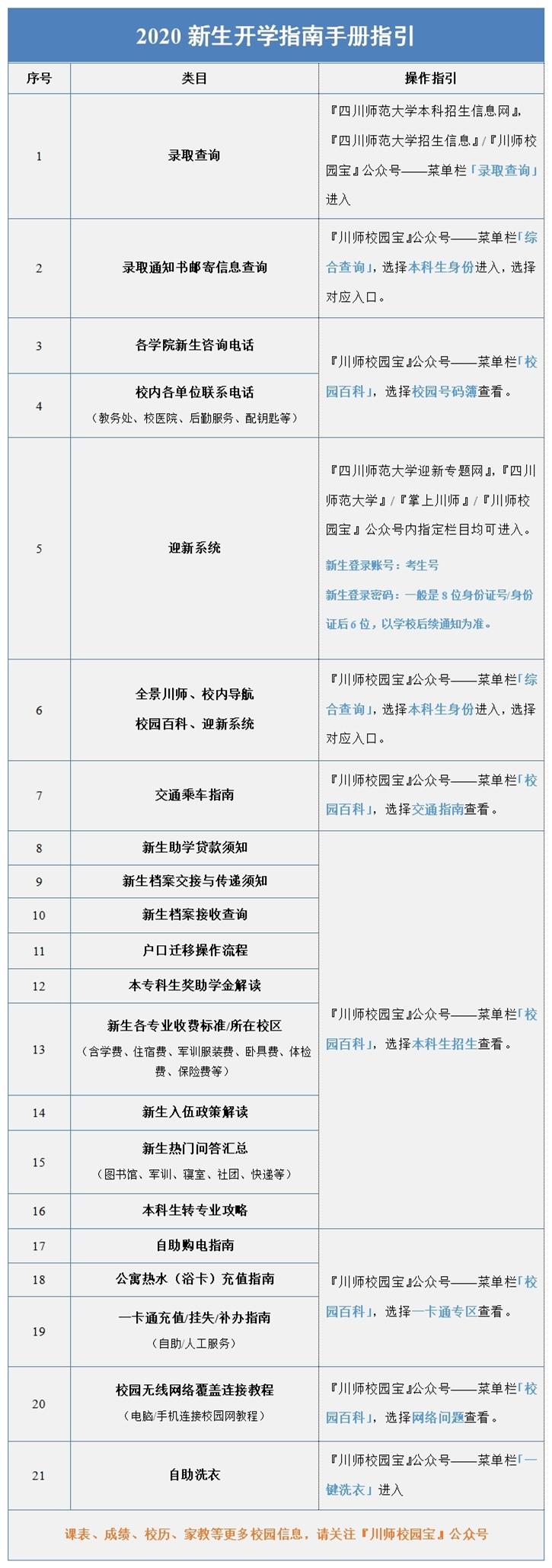 录取查询、全景师大、校内导航、迎新系统、新生档案查询、校园百科,请关注 【川师校园宝】 公众号。
