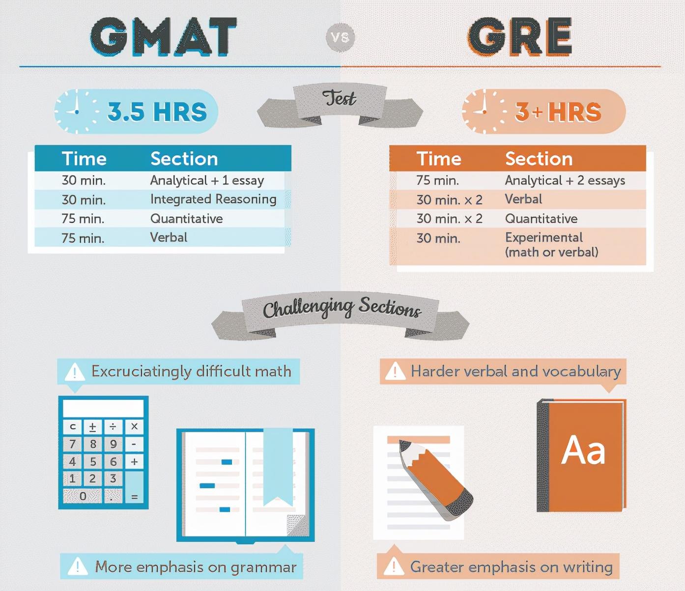 每项考试的相对容易程度不仅仅取决于内容。GMAT由四个不同的部分组成,这意味着要学习四个独立的部分以及掌握四个不同的部分的答题技巧。相比之下,GRE仅由三个部分组成。如果你的学习时间相对较短,GRE的难度相较于GMAT会稍低。当然,最重要的因素应该是看选择的学校是否接受某一考试。虽然现在许多商学院接受GRE,但有些依然不接受; 同时双学位课程也有各种其他专门的测试要求。
