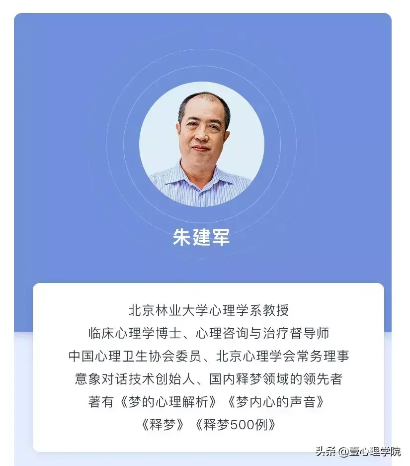 朱建军老师是中国心理学大牛,国内释梦领域权威和扛鼎人物,师从我国著名的心理学专家曾性初先生,是我国一位难得的在精神分析流派基础上独自创立心理咨询与治疗方法的学者。