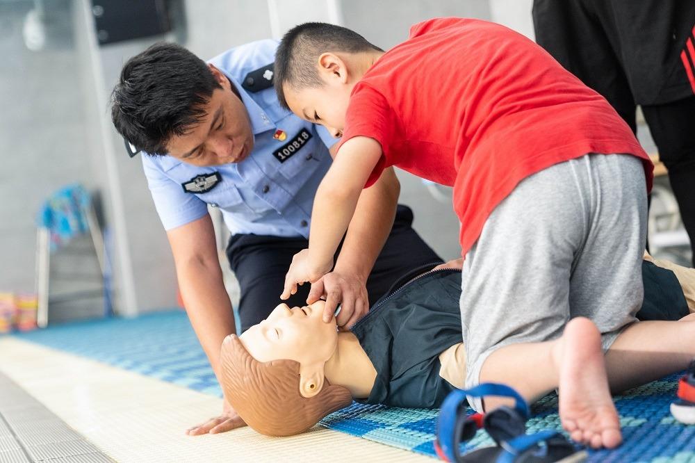 “快看!好像有人溺水了。”在大坪小学游泳池内,由市局水警总队民警扮演的“溺水者”挣扎着拍打水面,立即引起了现场参加活动中小学生们的注意,大家很快都围了过来。“这时,该怎么办?”一旁教学的民警随即提问道。