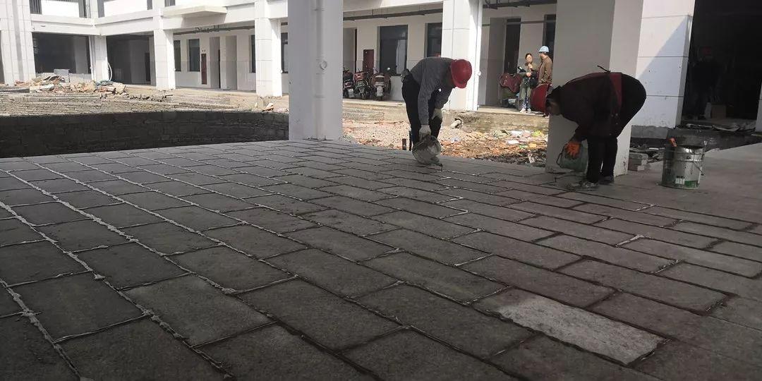 ▲建筑工人正在刚刚铺设的砖块细缝中灌浆