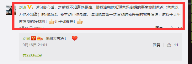 说句良心话,之前我不知道他是谁,跟我演完他知道爸妈离婚的事来宽慰爸爸(爸爸以为他不知道)的那场戏,我主动问他是谁,得知他是第一次演戏时我兴奋的找导演说:这孩子天生做演员的好材料!儿子你很棒!