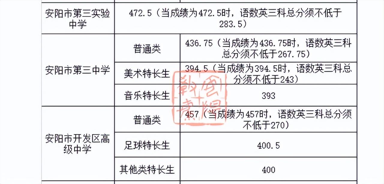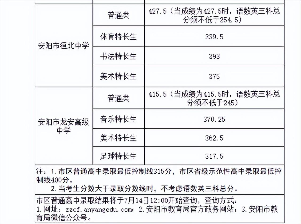 招收特长生的有二中体育特长生,分数线是480.5分。三中有美术特长生与音乐特长生,分数线分别是394.5分与393分。开发区高中有足球特长生及书法其他类特长生,录取分数线是400分与400.5分。洹北中学有体育,书法,美术。录取线分别是339.5分,393分,375分。龙安高中有音乐,美术,足球,录取分数线分别是370.25分,362.5分,317.5分。