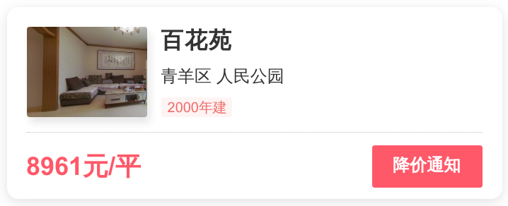 汇厦少城文墨阁(建筑年代:2018;均价:27642.0元/㎡) 汇厦少城锦官郡(建筑年代:2017;均价:27069.2元/㎡) 旭和倾城二期(建筑年代:2014;均价:25562.4元/㎡) 汇厦少城百花里(建筑年代:2014;均价:25465.7元/㎡) 旭和倾城一期(建筑年代:2014;均价:24685.7元/㎡)以上即为幸福里对百花苑的测评内容,小区具体信息请以实际情况为准,欢迎下载幸福里app看房选房。