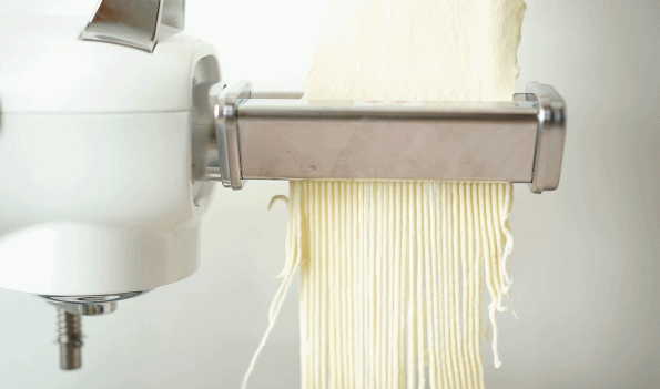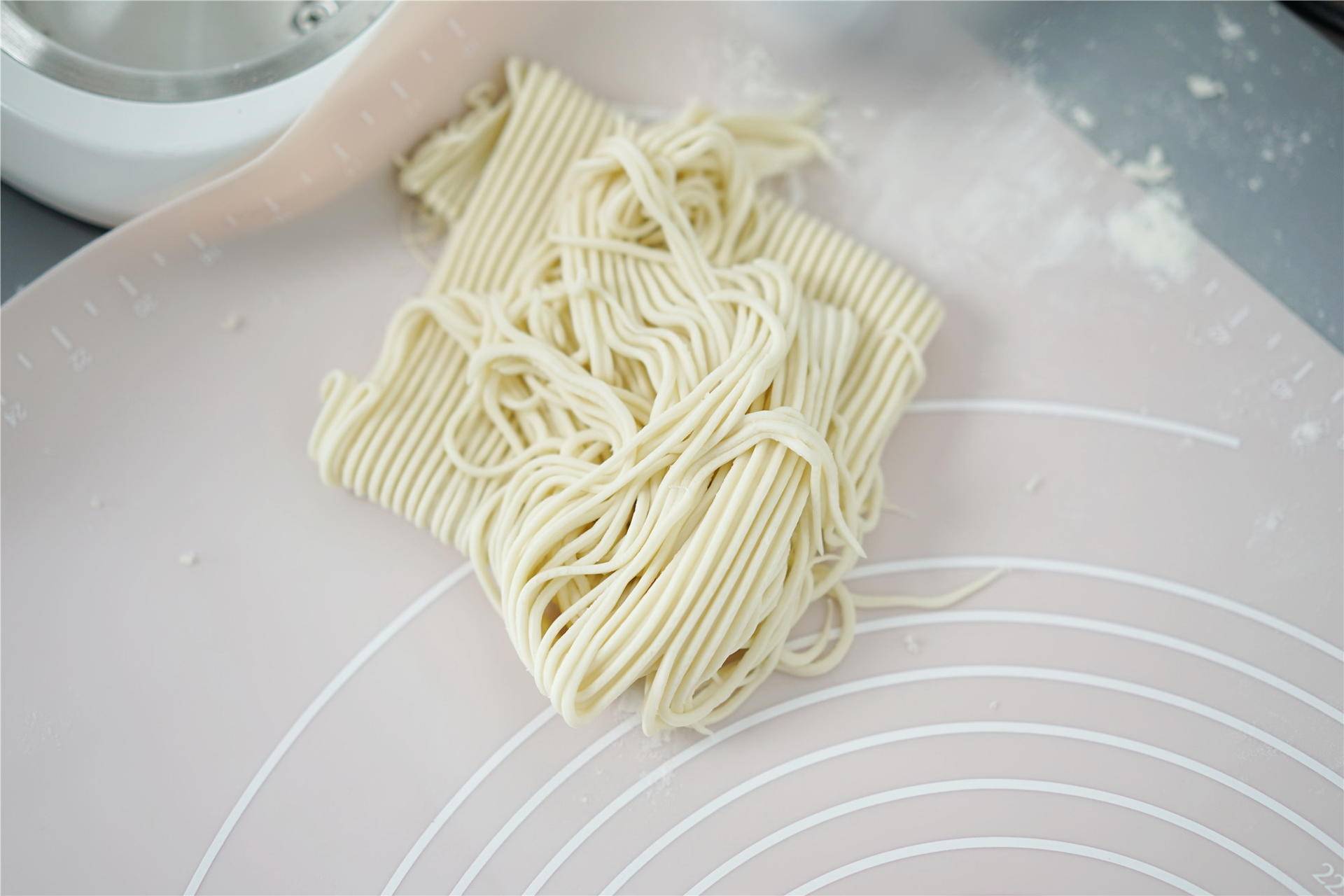 制作好的面皮在通过细面条机带固定宽度的滚轴后,出来的就是制作好的细面条,工作原理和大型制面设备没有本质上的区别。