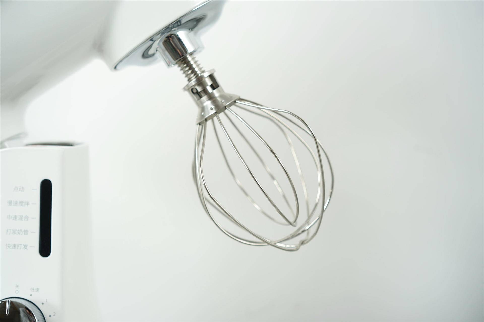 不锈钢打蛋笼,桨丝分层设计,可增加食材接触空间。多达12根桨丝,实现一次均匀打发。