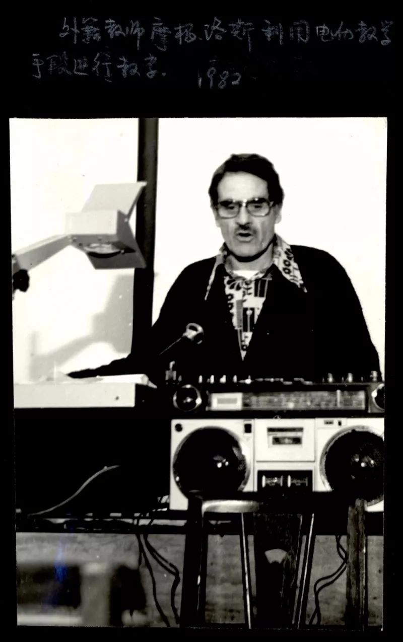 1982年外籍教师摩根·洛斯利用电化教学手段讲课