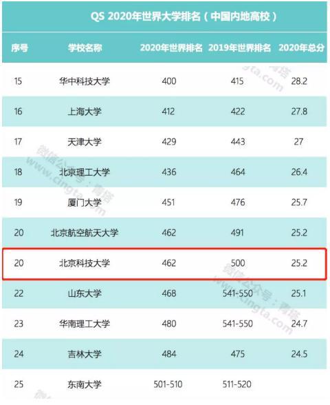 2019年,学校位列2020QS世界大学排行榜第462位,进入全国高校前20;