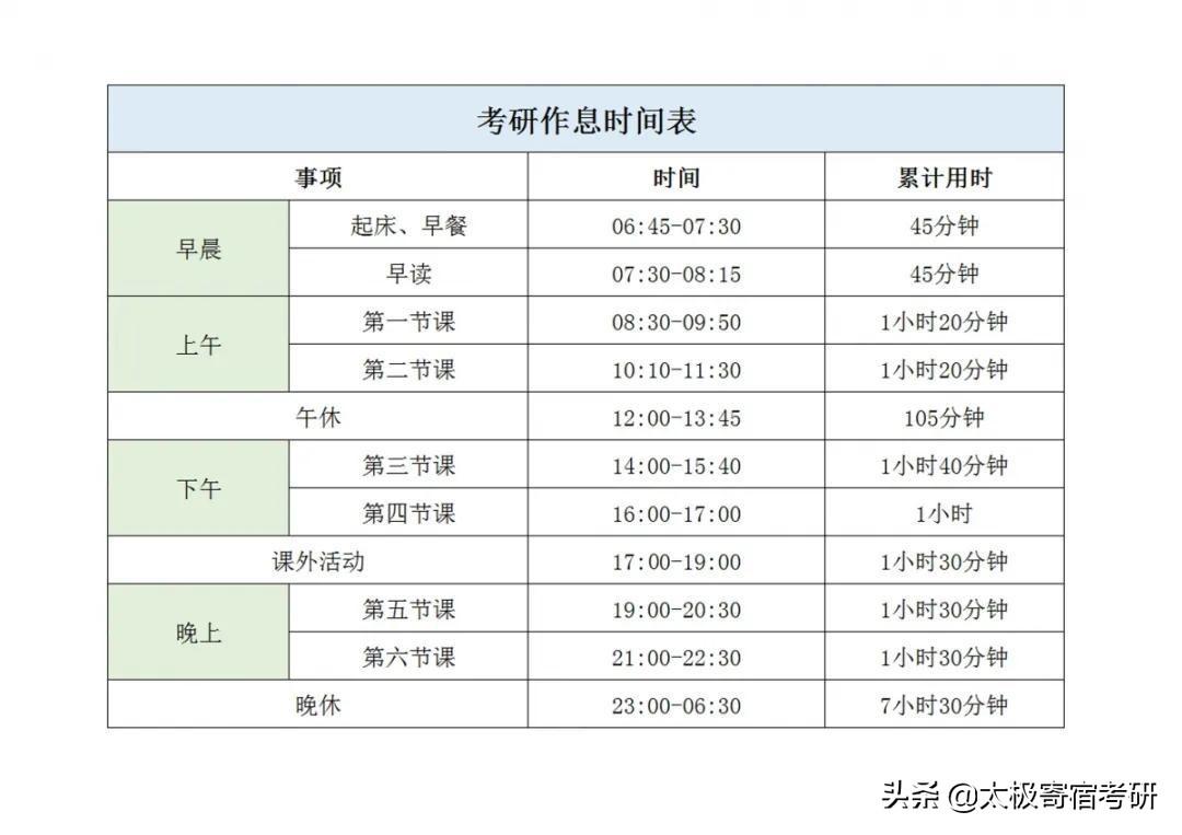 从6:45到22:30学习,早上叫醒、晚上查寝,晨读、提高记忆,午休、劳逸结合,1周休息1天。