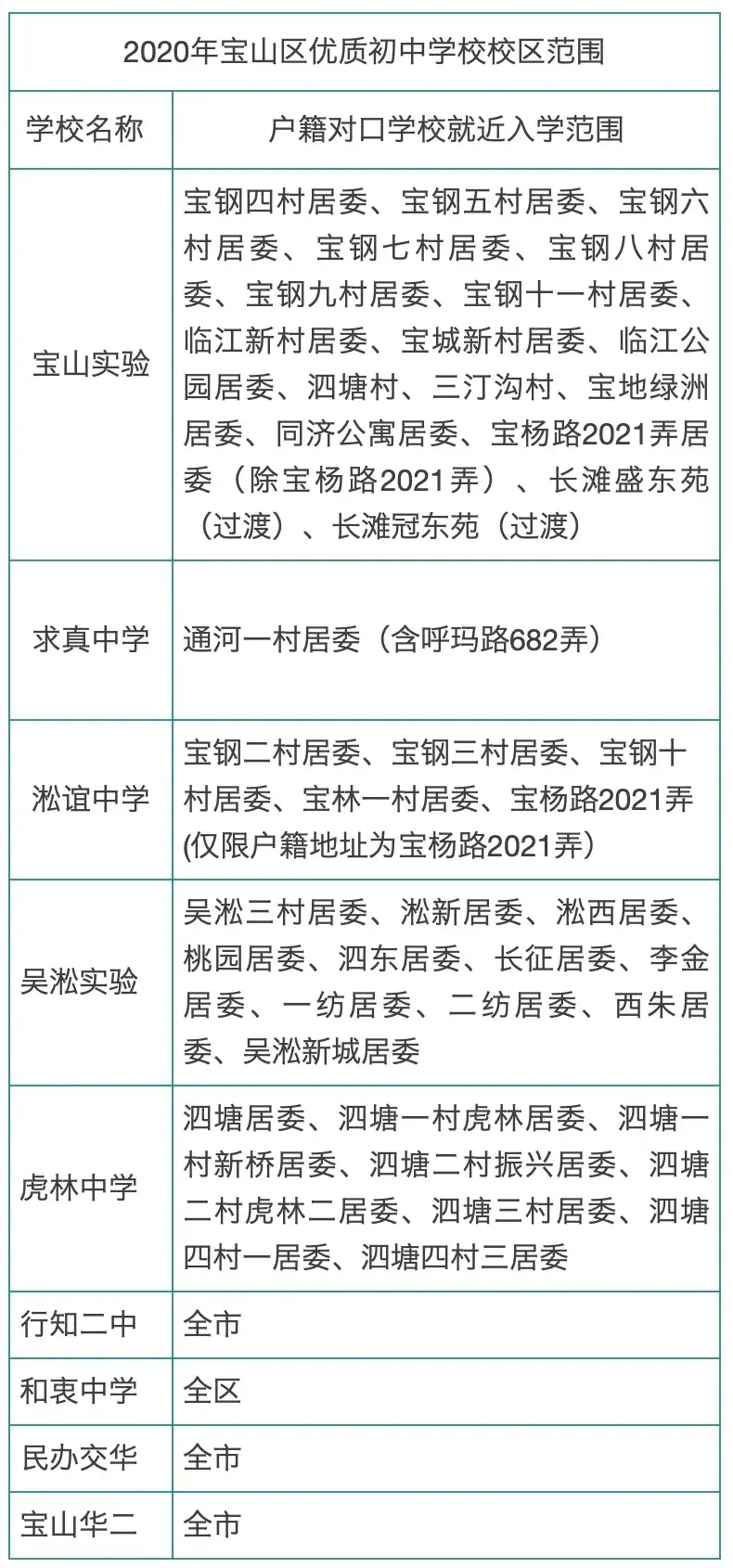 2020宝山区优质初中对口